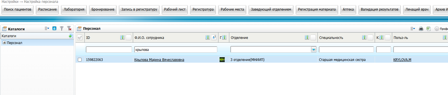- Найти нужного нам сотрудника по пути: Настройки → Настройка персонала ( не забыв при этом ПКМ в столбце каталоги и выбор пункта [Список] ). Запоминаем ФИО и Отделение