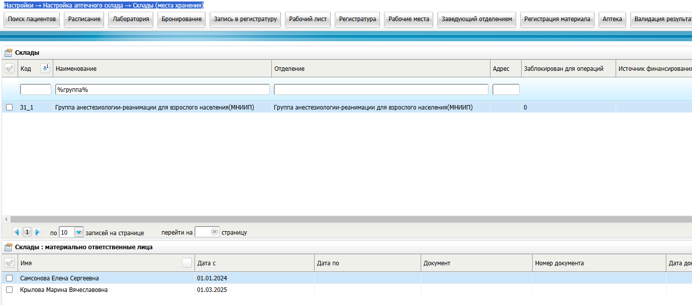 - После переходим по пути : Настройки → Настройка аптечного склада → Склады (места хранения). В строке наименование ставим [%] в начале и конце и вписываем ключевое слово касаемо склада.