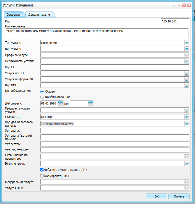 Окно редактирования услуги и возможные изменения : ПКМ по услуге - [Редактировать]