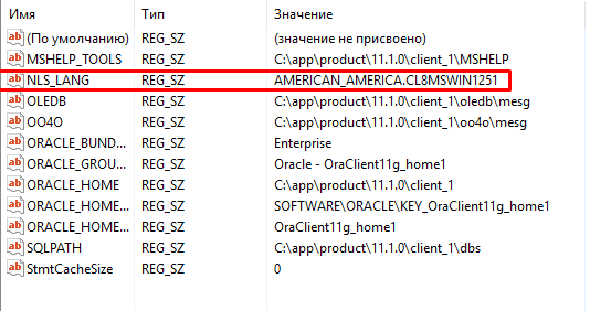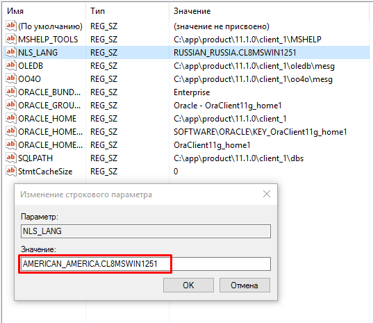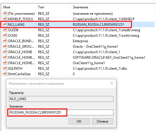 переходим по пути: HKEY_LOCAL_MACHINE\SOFTWARE\WOW6432Node\ORACLE\KEY_OraClient11g_home1 и исправляем имя файла NLS_LANG так как указано на скриншотах ниже: