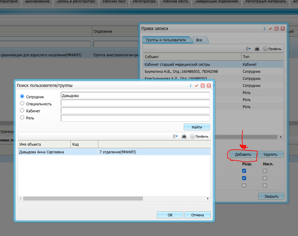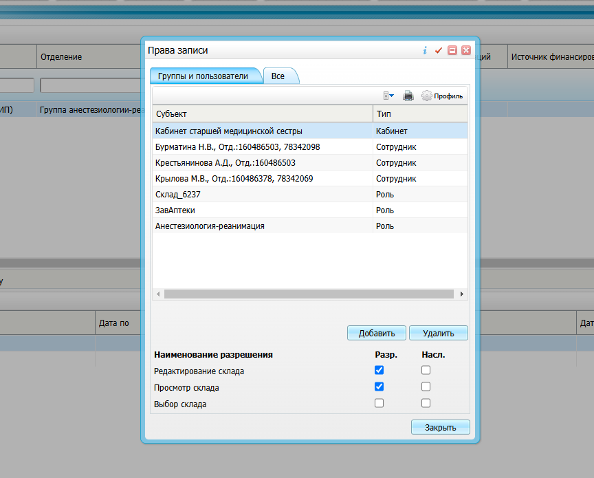 - Так же в этом же Окне , мы можем выбрать пункт [Добавить] и найти сотрудника для добавления на нужный нам склад. После чего не забыть предыдущий пункт и добавить ему нужные разрешения.