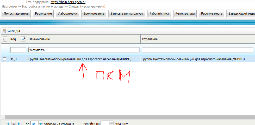 - После переходим по пути : Настройки → Настройка аптечного склада → Склады (места хранения). В строке наименование ставим [%] в начале и конце и вписываем ключевое слово касаемо склада.