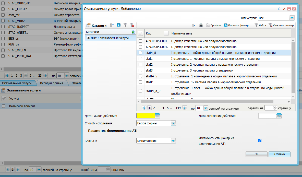 - В открывшемся окне , снова в столбце каталоги нажимаем ПКМ - Список . И производим поиск нужной нам услуги по Коду или Наименованию. После чего выбираем услугу галочкой и нажимаем [OK]