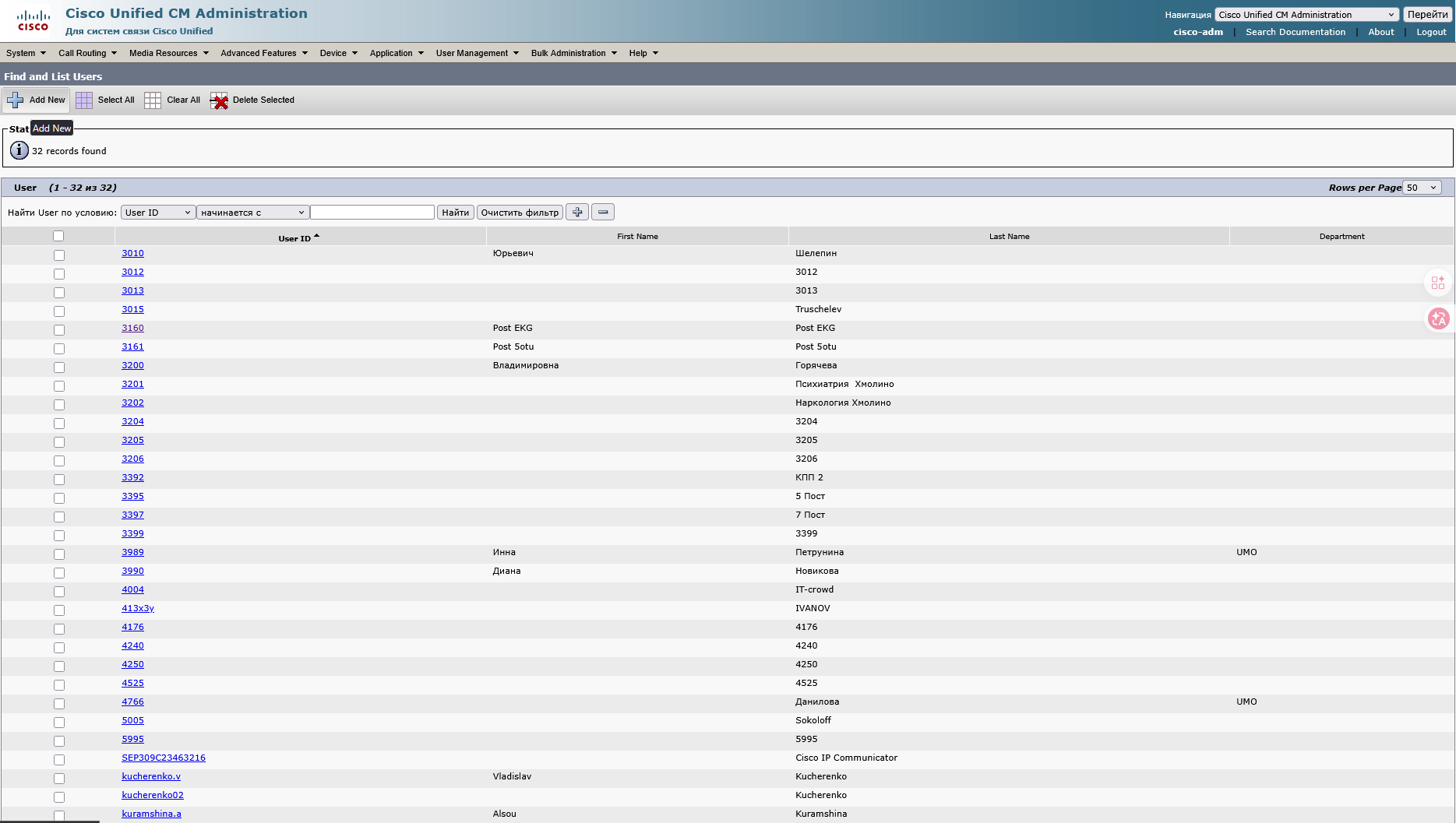 В Cisco Unified CM Administration в разделе User Management выбираем подраздел End user