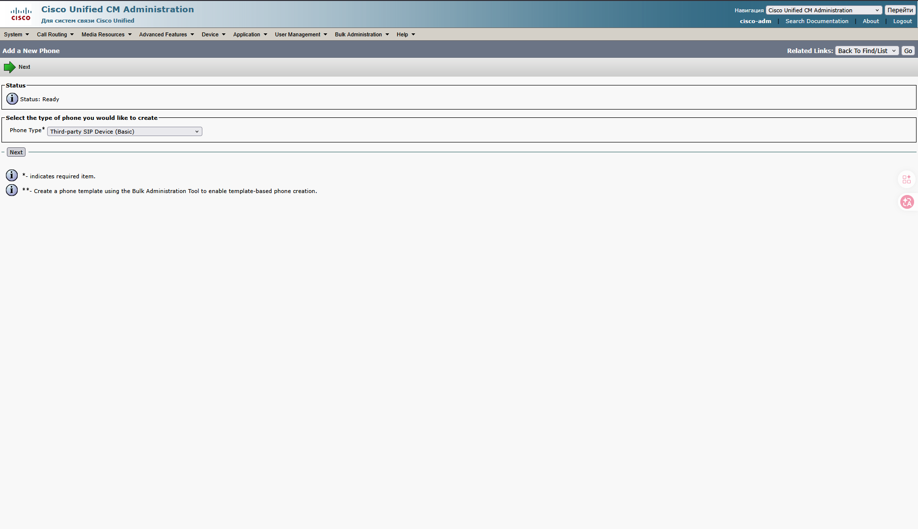 В поле Phone type выбираем Third-party SIP Device (Basic) или (Advanced), и нажимаем Next