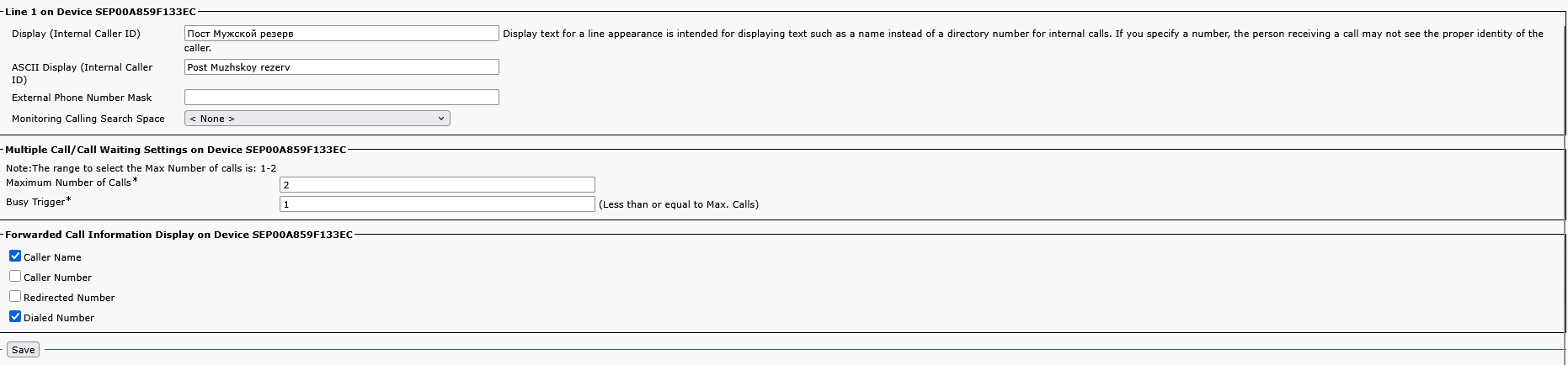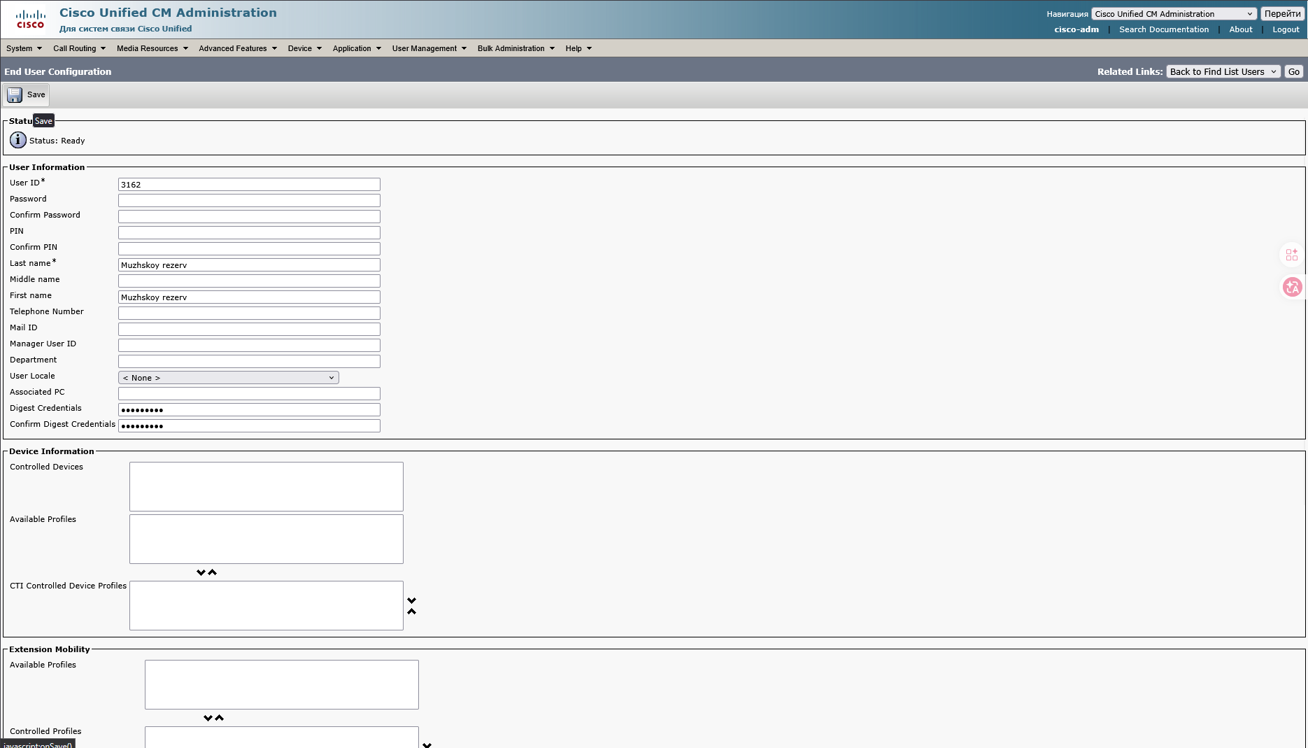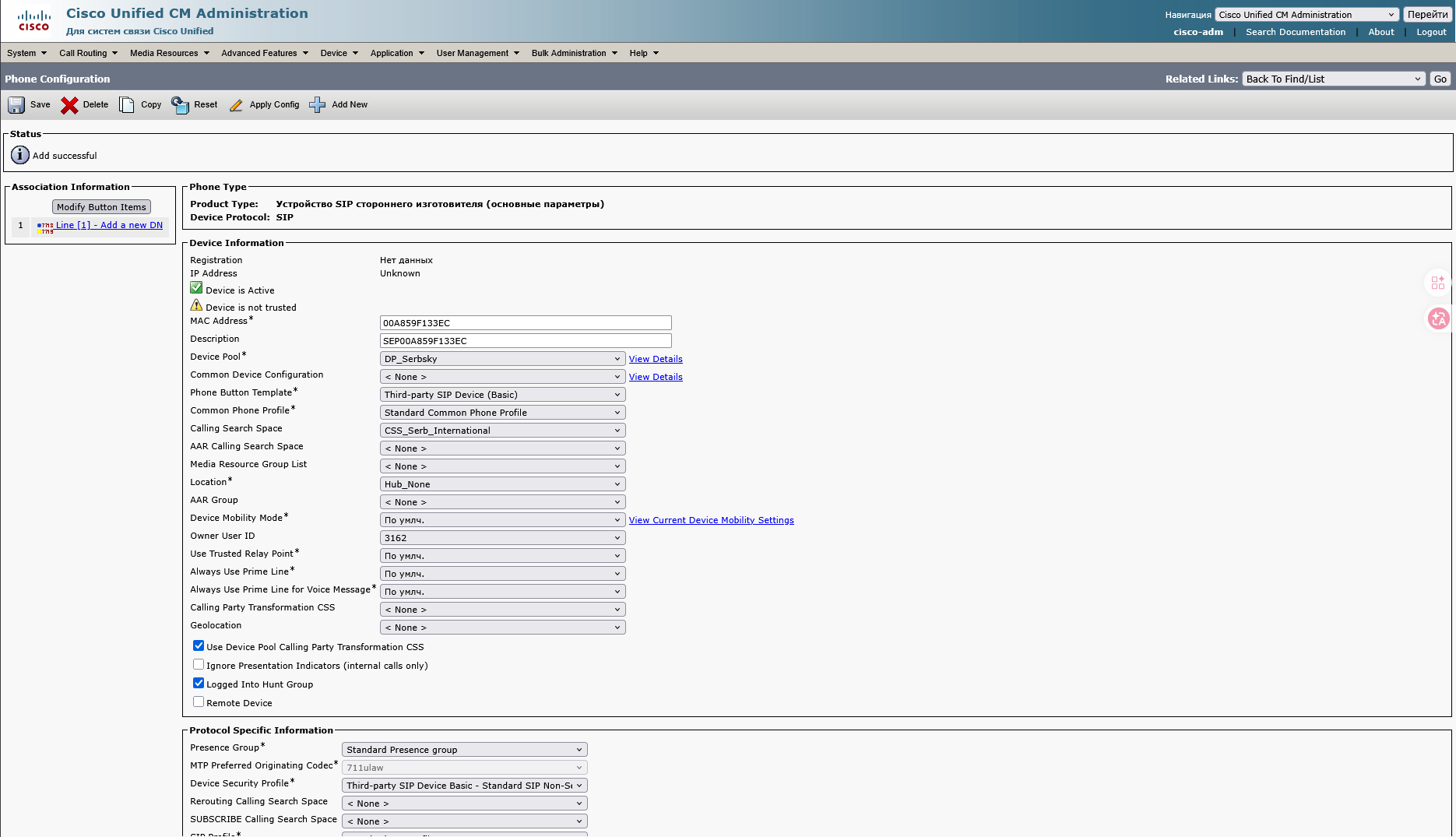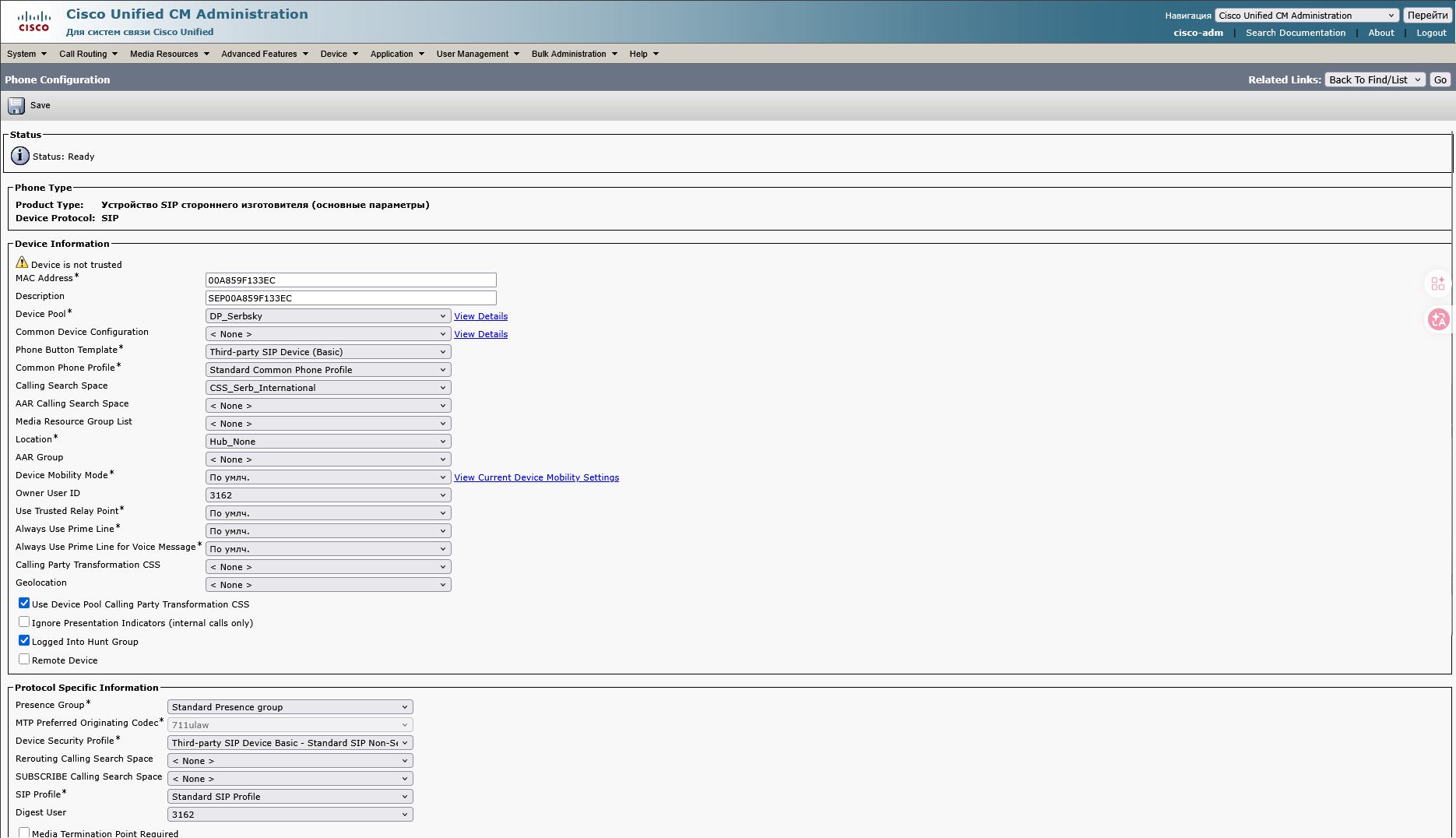 На странице Phone configuration 7.1 Вводим MAC-адрес телефона 7.2 Device pool выбираем DP_Serbsky 7.4 Calling Search Space выбираем CSS_Serb_International 7.5 Owner User ID выбираем номер USER ID который вы создавали Такжев Protocol Specific Information 1. Device Security Profile выбираем Third-party SIP Device 2. SIP Profile выбираем Standart SIP Profile 3. Digest User выбираем USER ID который вы создавали Далее нажимаем Save