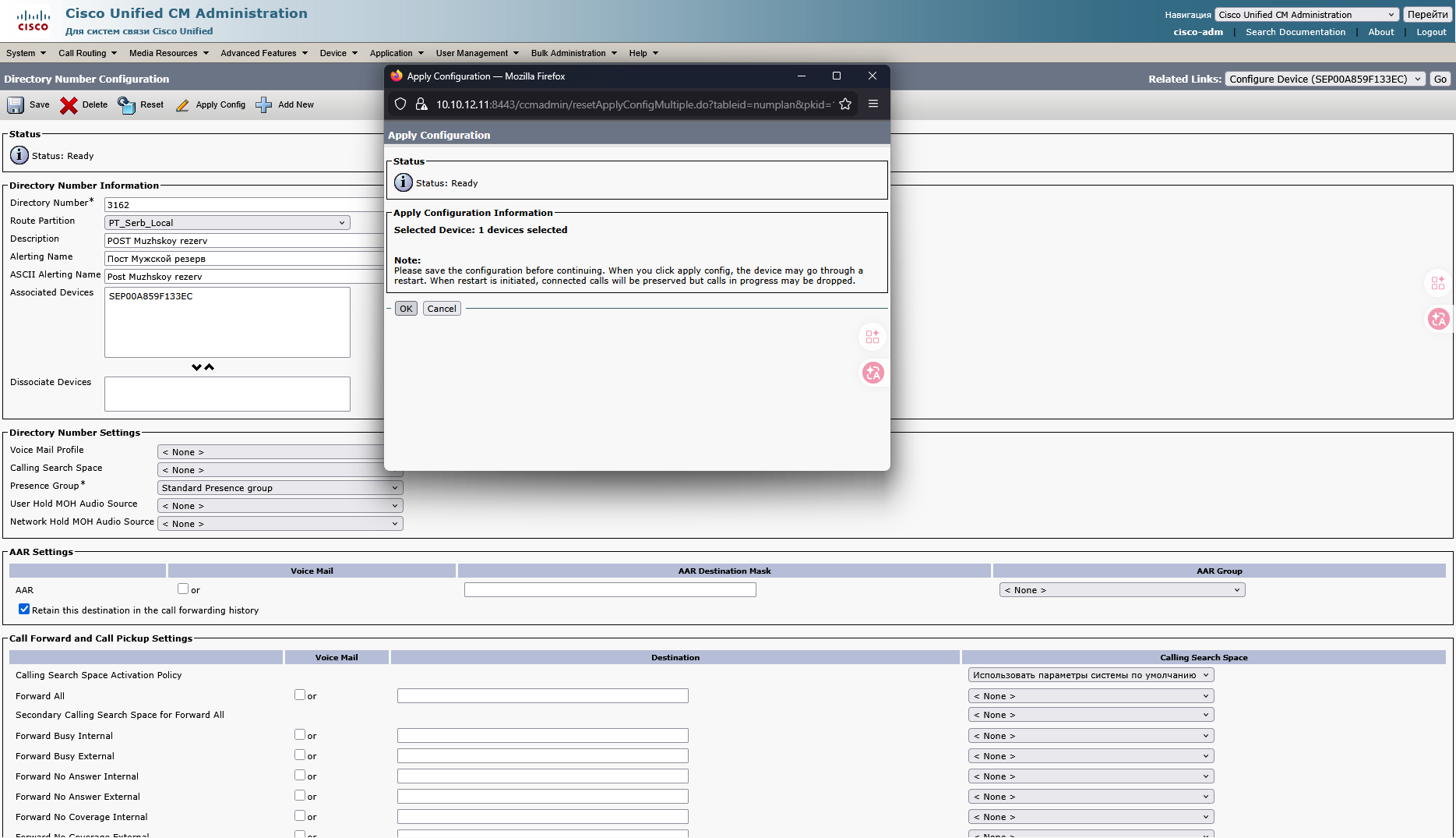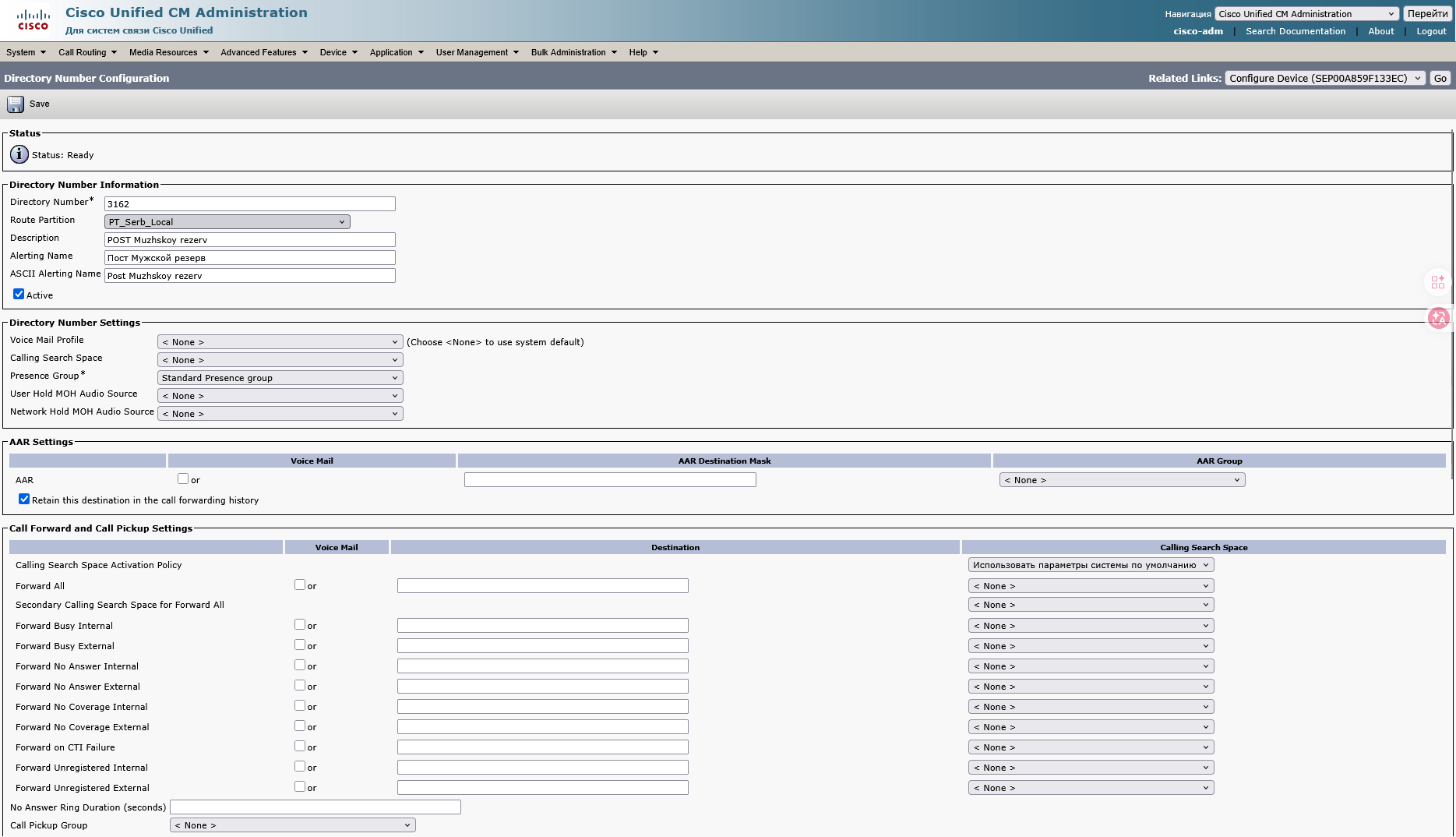 На странице Directory Number Configuration 9.1 Directory number пишем номер телефона 9.2 В Route Partition выбираем PT_Serb_Local 9.3 В полях Description, Alerting name, ASCII Alerting name пишем имя